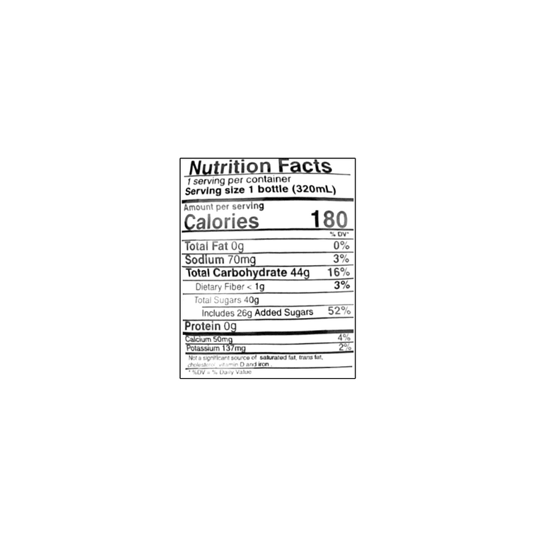 Mango juice 25%, fructose 4%, citric acid 0.15, added artificial color and natural same preservative, contains color FD, C yellow #5, benzoic acid as preservative.