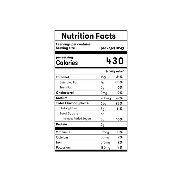 [pasta 79.60 g] wheat flour, tapioca starch, Palm oil, gluten, salt, emulsifier E322 (soy), onion extract, raising agent, thickener E412,mixed tocopherol powder, flavor (green tea),Riboflavins, acidity regulator E330. [Spice liquid 24.50 g] Water, flavor (chicken meat) 18.956%, sugar, soy sauce, chili powder, soybean oil, red pepper powder, onions, chili extract, flavor enhancer E621, garlic, modified potato starch, red pepper oil , paprika extract, black pepper powder, fermented powder. [Dried pasta garnish 0.90 g] Roasted sesame, roasted seaweed. Product may contain traces of eggs, milk, fish and seafood.